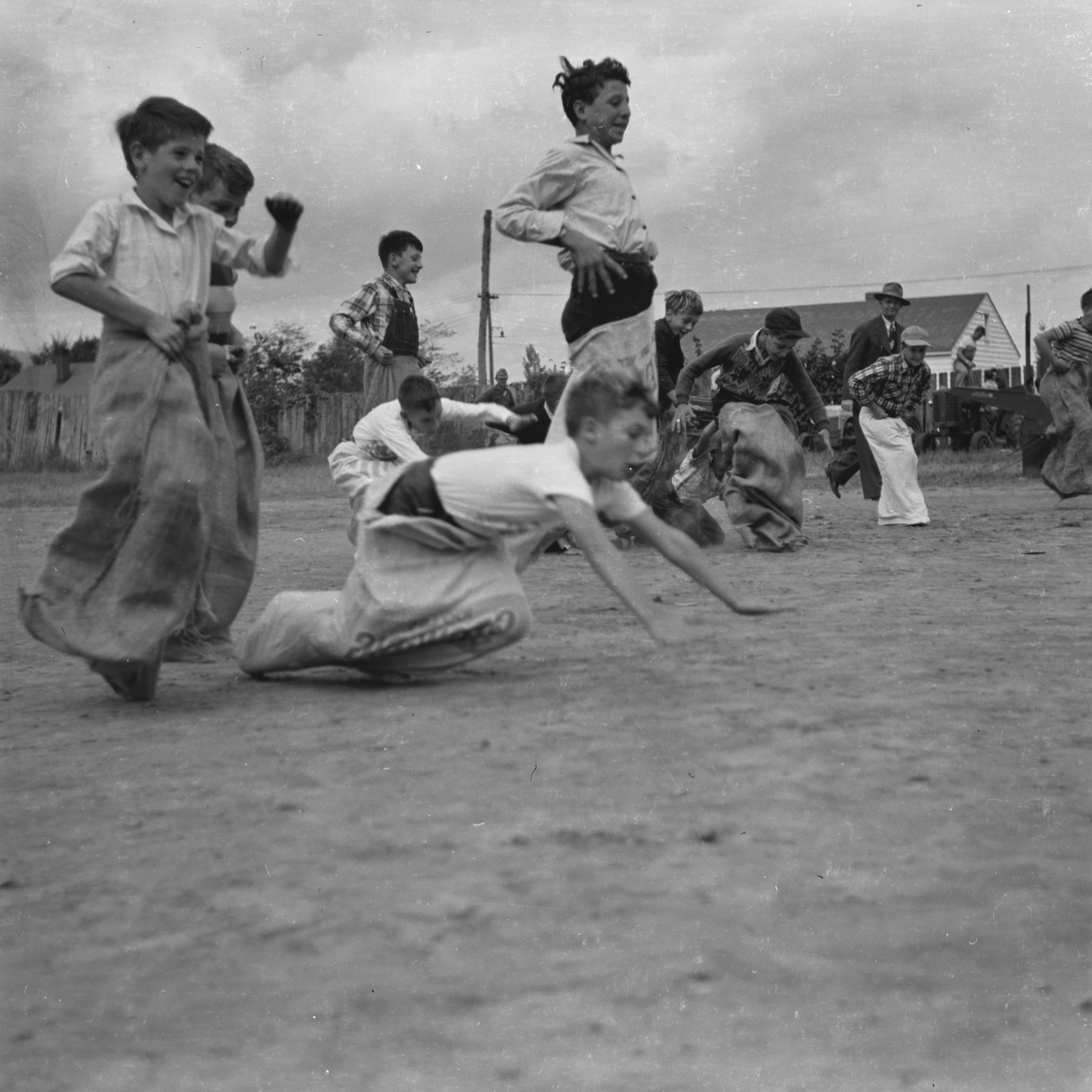 Photograph of a sack race at the Triplett School Fair taken on October 19-20, 1950.
