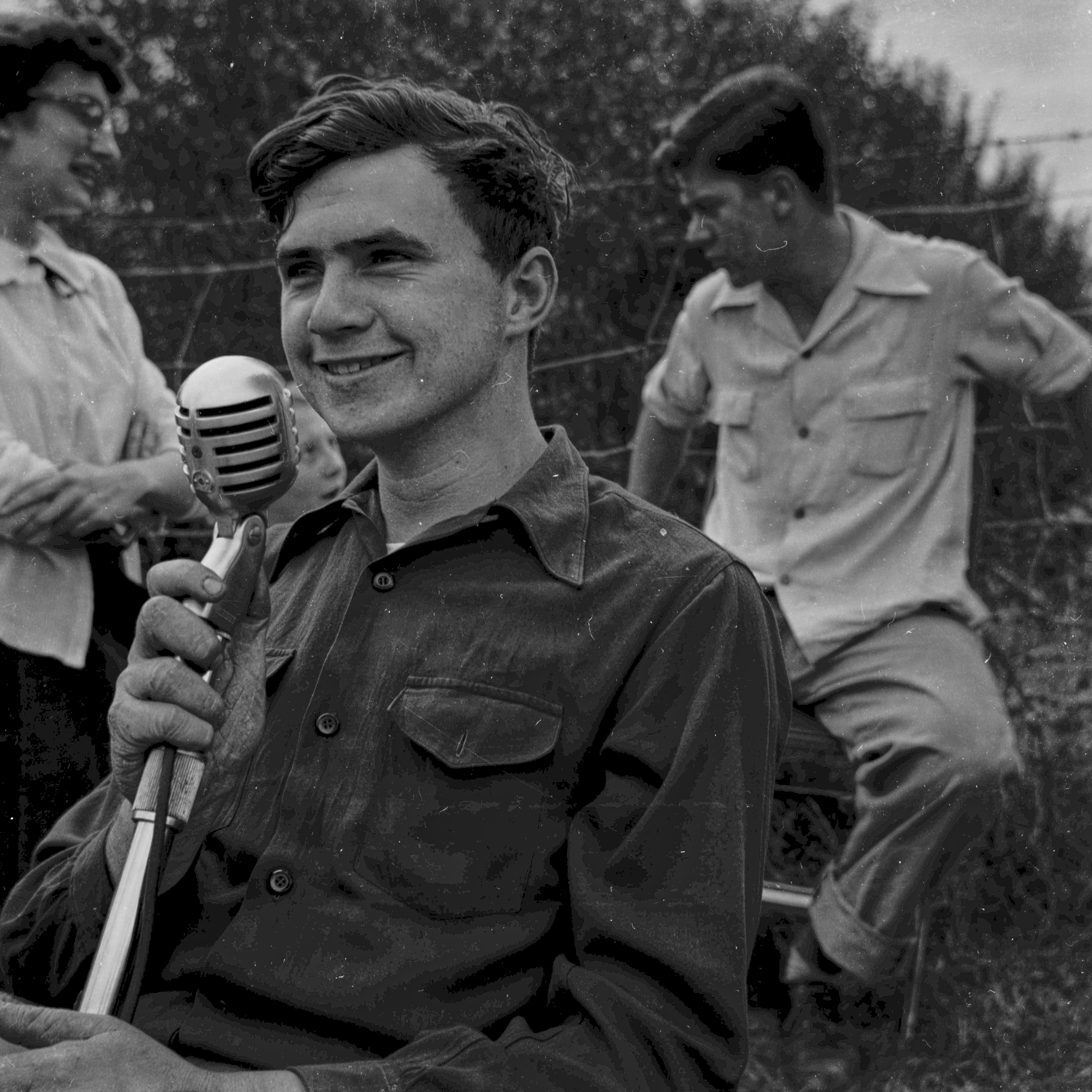 Photograph of a James Bowman with a microphone at the Triplett School Fair taken on October 19-20, 1950. Don Buchanan is visible in the background.