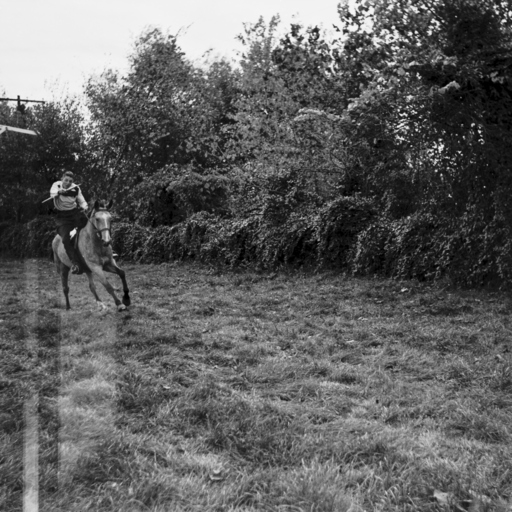 Photograph of a horse event at the Triplett School Fair taken on October 19-20, 1950. This event involved penetrating a suspended ring with a lance while riding a running horse.