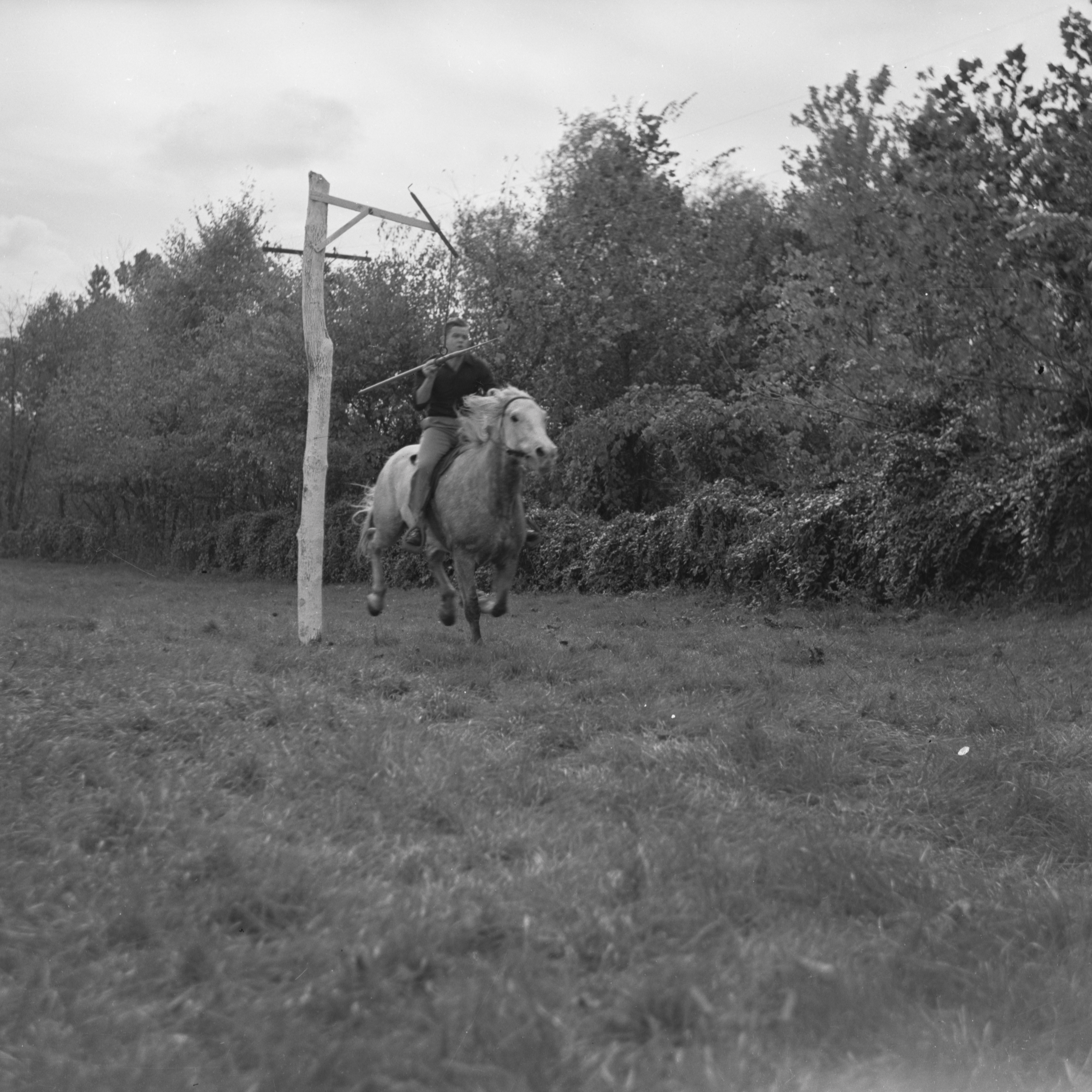 Photograph of a horse event at the Triplett School Fair taken on October 19-20, 1950. This event involved penetrating a suspended ring with a lance while riding a running horse.