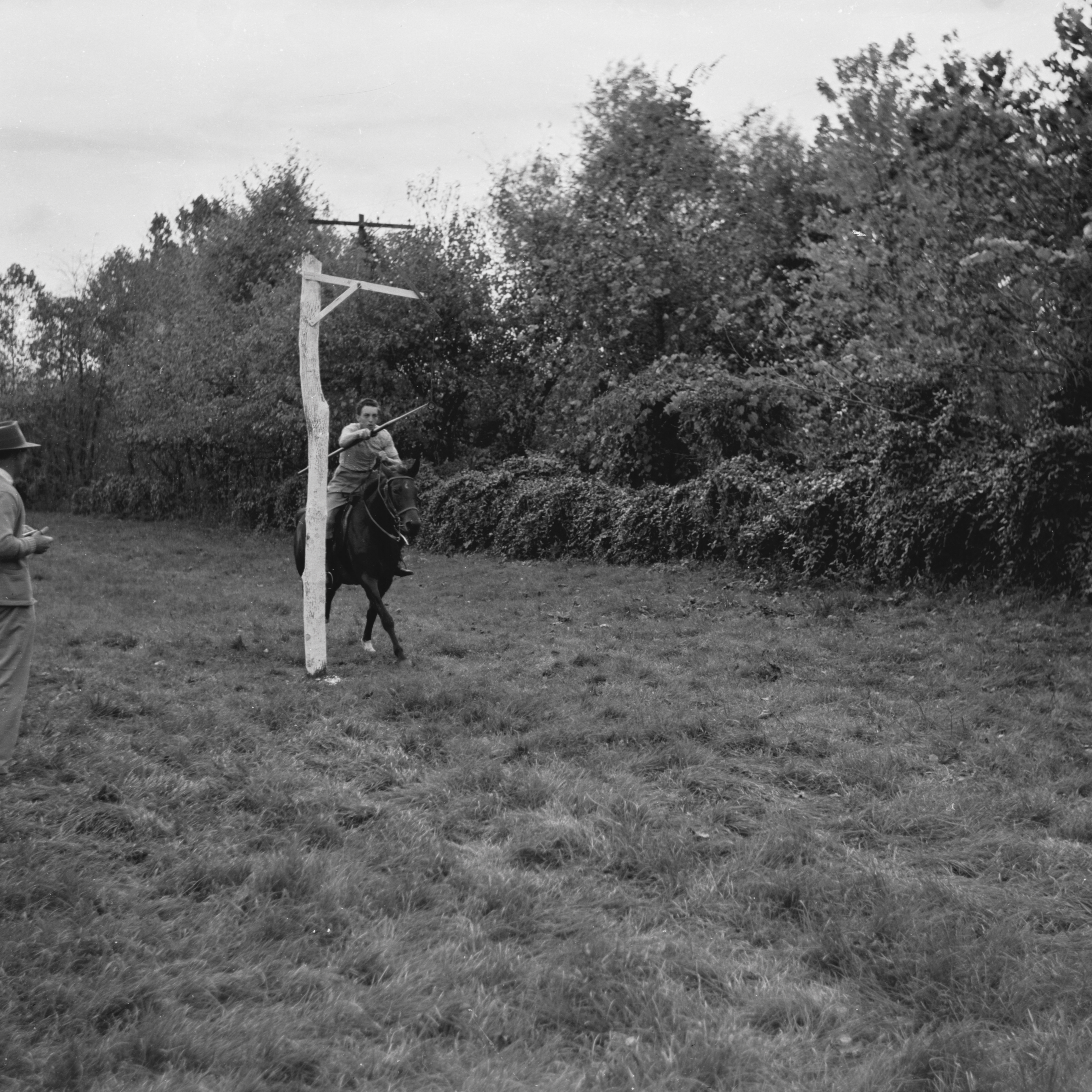 Photograph of a horse event at the Triplett School Fair taken on October 19-20, 1950. This event involved penetrating a suspended ring with a lance while riding a running horse.