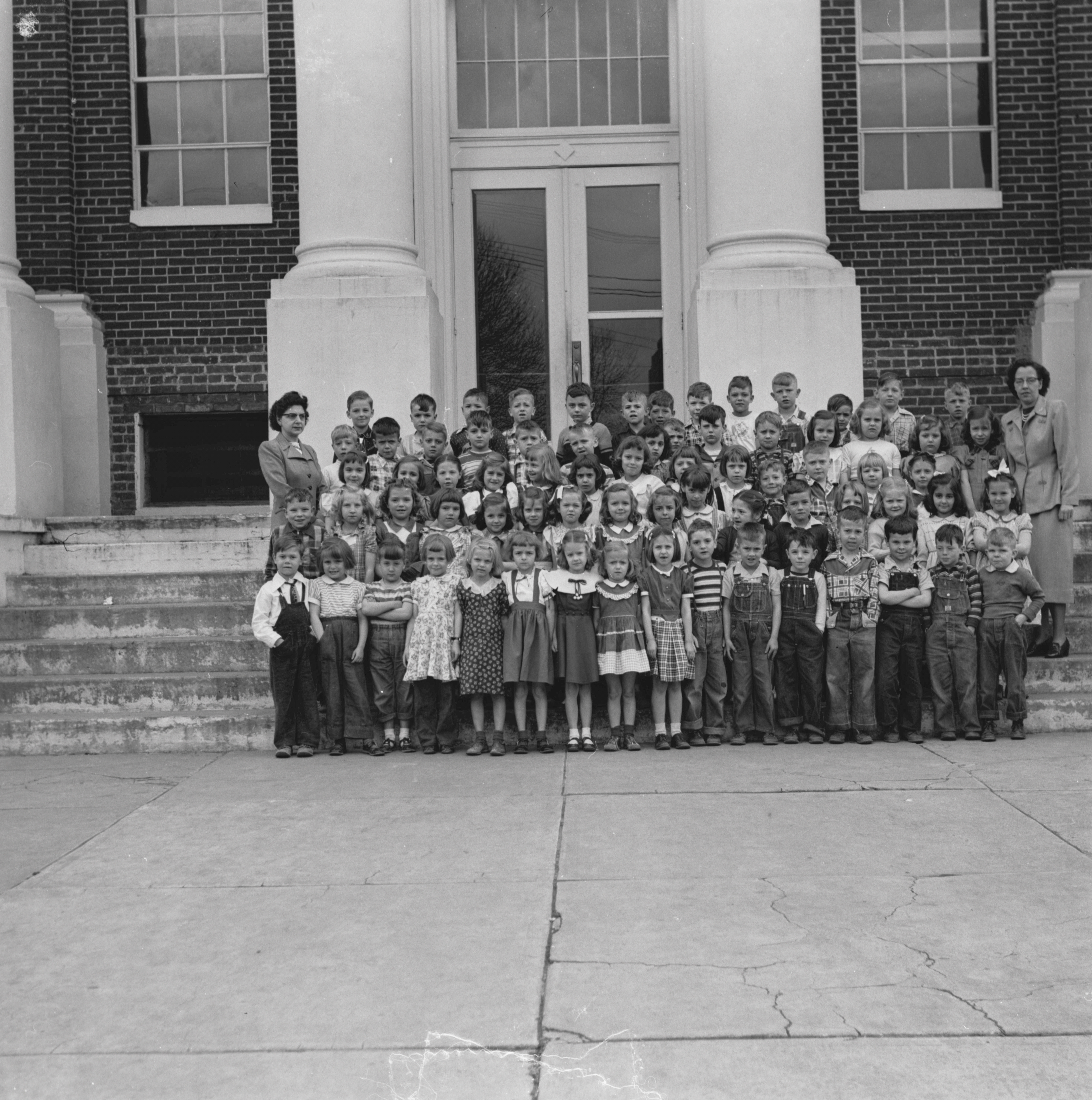 Group photograph of Triplett's first grade students standing on the steps of the school taken on April 4, 1951.