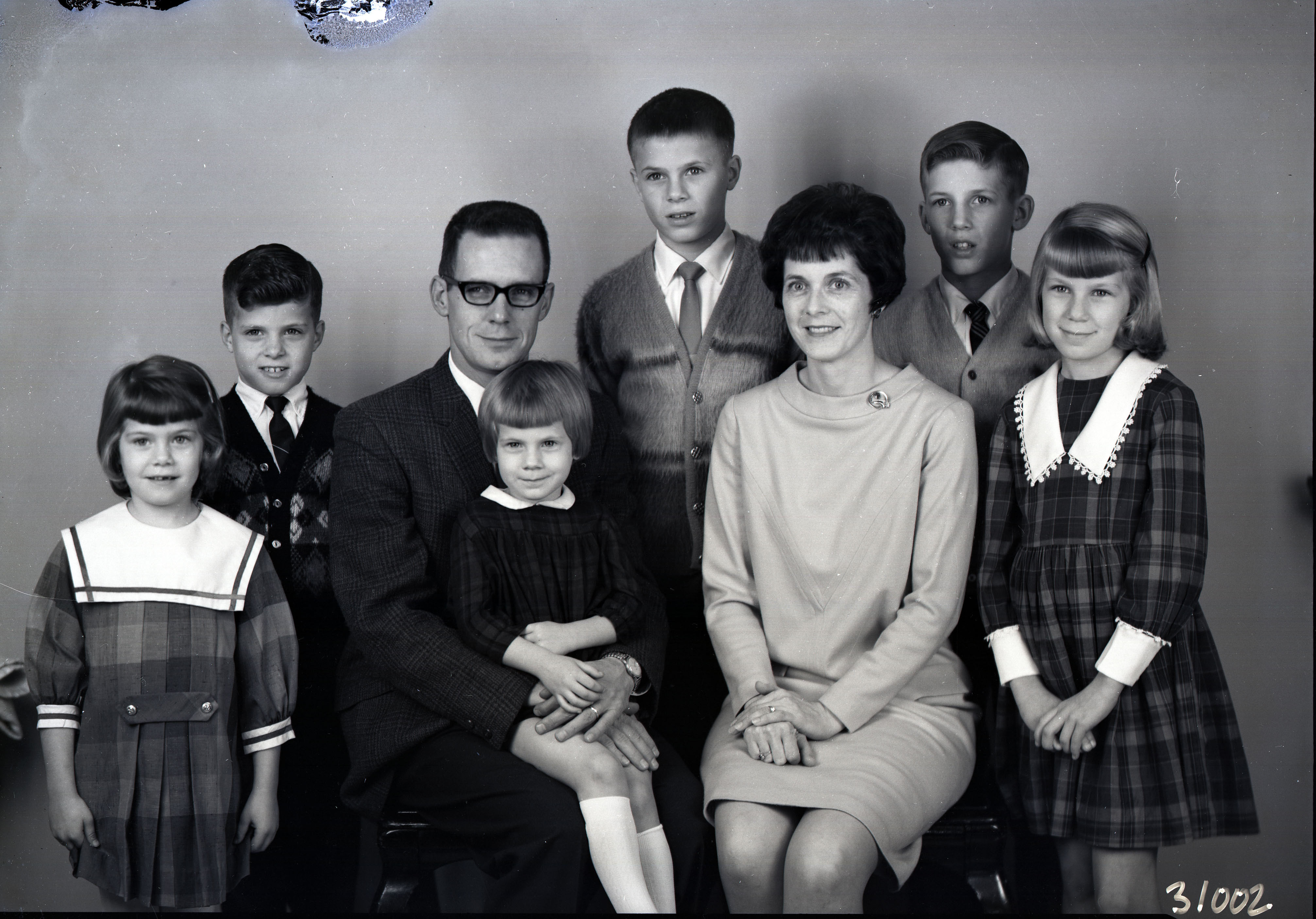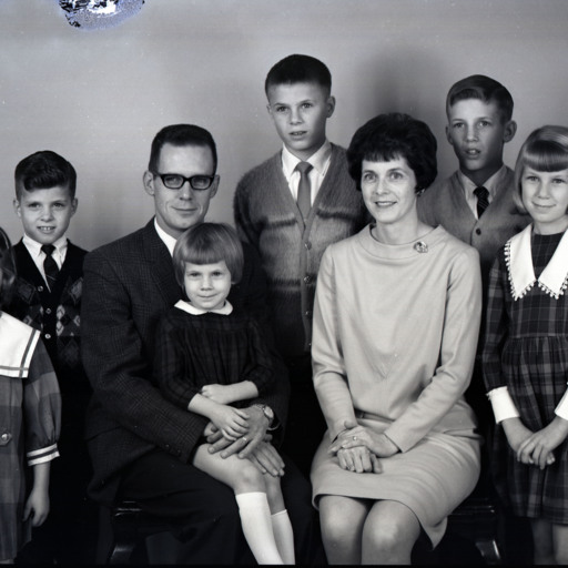 Unidentified man and woman are seated with six children of varying ages (three boys and three girls) posed around them.