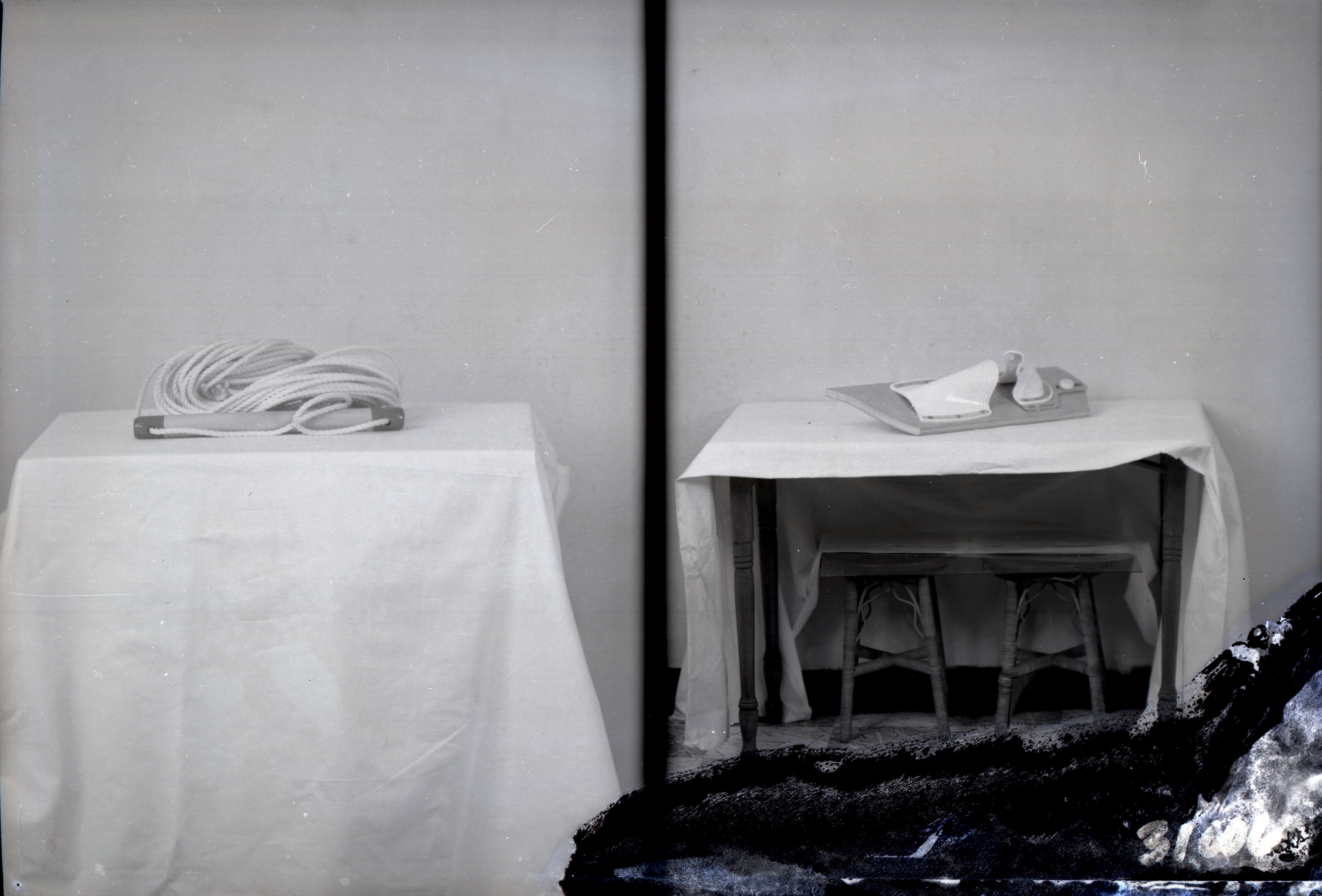 On the left, a ski rope is shown on a table.
