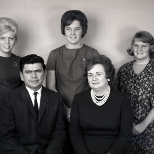 An unidentified man is seated beside an unidentified woman. Behind them are three additional unidentified women.
