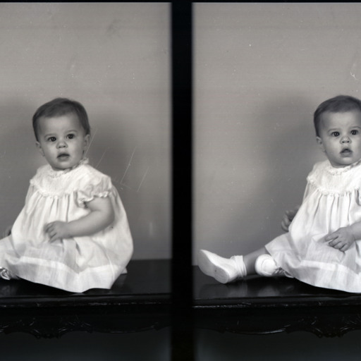 Photo of two separate photographs of the same unidentified young child, shown seated.