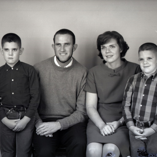 Unidentified bearded man and woman are seated together with their hands in their laps and flanked by two young boys.