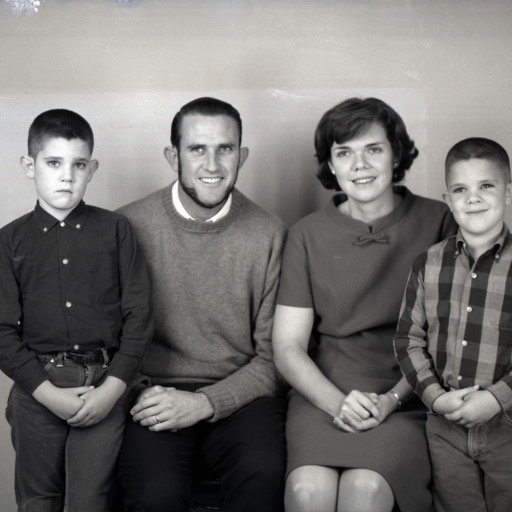 Unidentified bearded man and woman are seated together with their hands in their laps and flanked by two young boys.