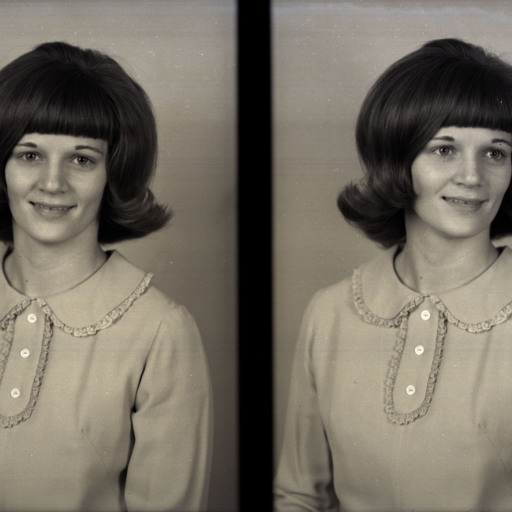 Photo of two separate portrait photographs of the same unidentified young woman with bangs and wearing her hair curled outwards in a "flip" style.