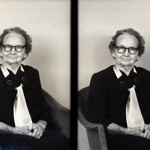 Photo of two separate portrait photographs of the same unidentified older woman with short hair and glasses. She is seated on a wicker chair with her hands in her lap.