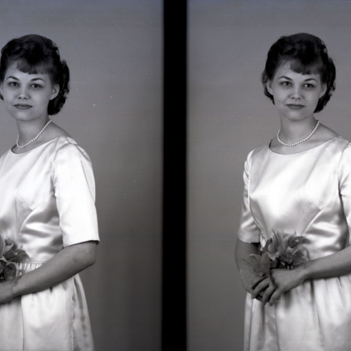 Photo of two separate photographs of the same unidentified young woman with short hair in a formal gown and holding a small bouquet. She is wearing faux pearls.