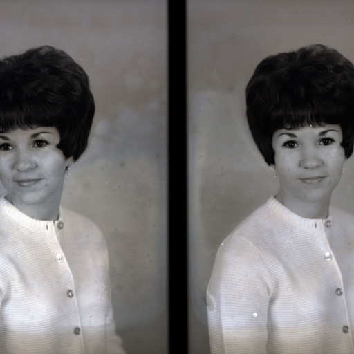 Photo of two separate portrait photographs of the same young woman with short styled hair and wearing a sweater that buttons up the front.