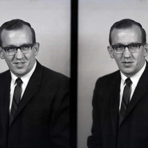 Photo of two separate portrait photographs of the same unidentified man with glasses and wearing a suit and tie.