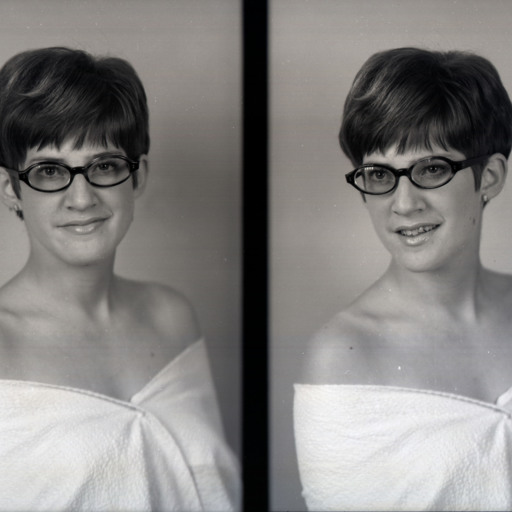 Photo of two separate portrait photographs of an unidentified young woman with very short hair and glasses. She is wearing a photographer's drape.