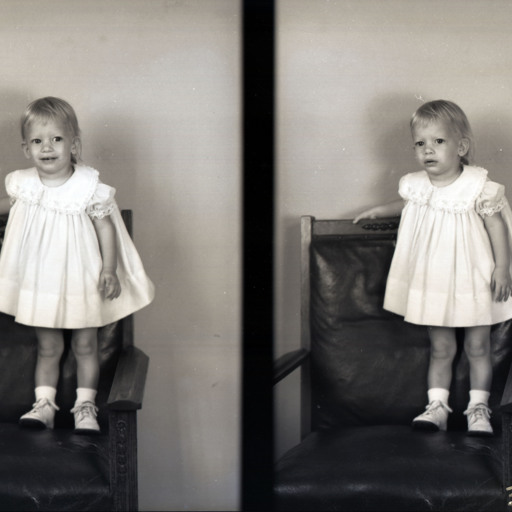 Photo of two separate photographs of the same unidentified child standing on a chair.