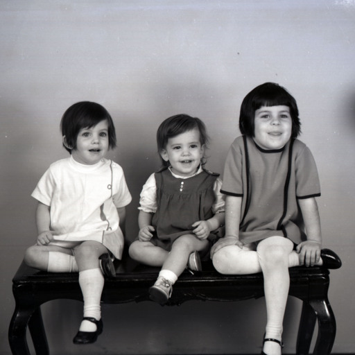 Three unidentified young children of different ages are posed together on a bench. Each has one leg under the other.