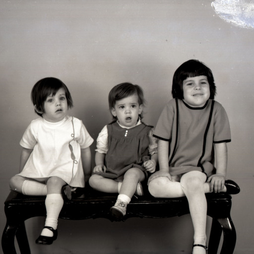 Three unidentified young children of different ages are posed together on a bench. Each has one leg under the other.