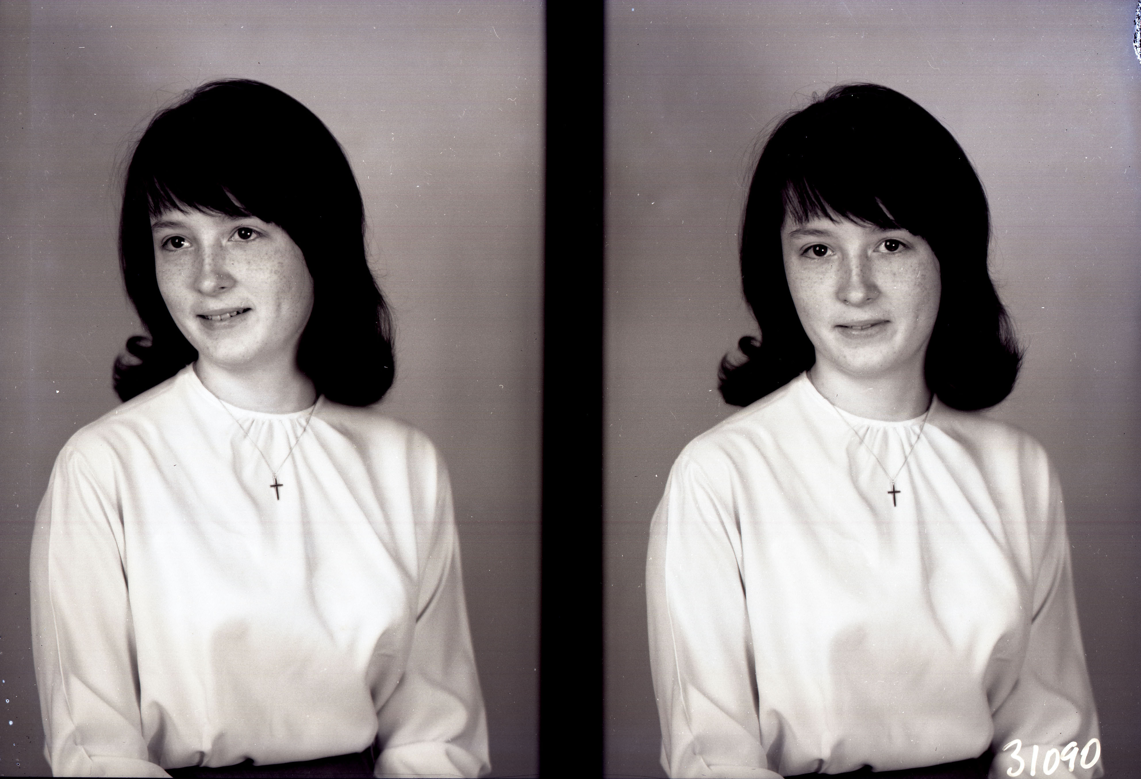Photo of two separate portrait photographs of the same unidentified young woman, probably teenaged, with shoulder-length hair curled outwards, bangs, and wearing a cross necklace with her skirt and blouse.