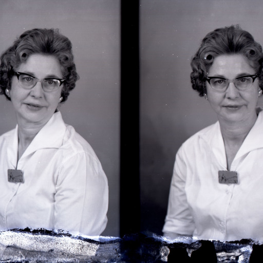 Photo of two separate portrait photographs of the same unidentified woman with short hair and glasses. She is wearing a rectangular pin with writing on it.