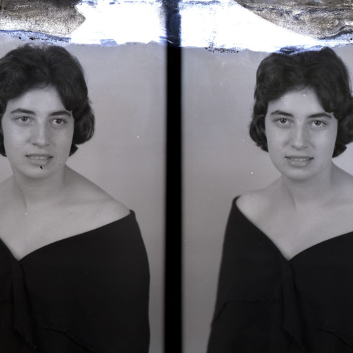 Photo of two separate portrait photographs of the same unidentified young woman with short hair and wearing a photographer's drape.
