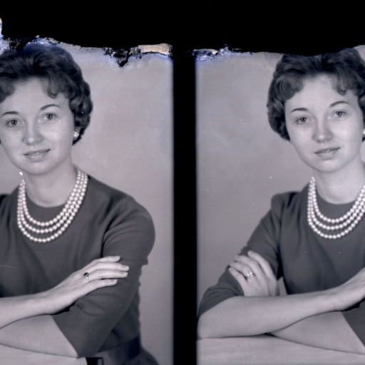 Photo of two separate portrait photographs of the same unidentified woman with short hair and posed with her arms folded in front of her.