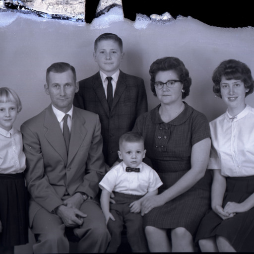 Unidentified man and woman are seated together with four children of varying ages posed around them.