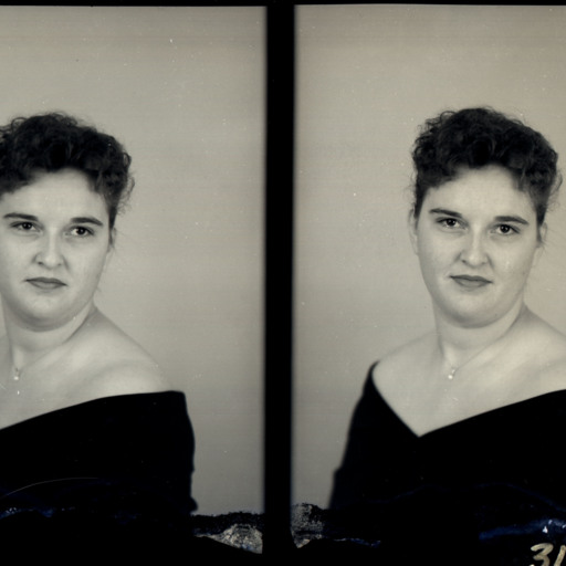 Photo of two separate portrait photographs of the same unidentified young woman with short hair and wearing a photographer's drape.