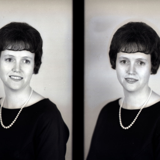 Photo of two separate portrait photographs of the same unidentified woman with short styled hair and wearing faux pearls with her outfit.