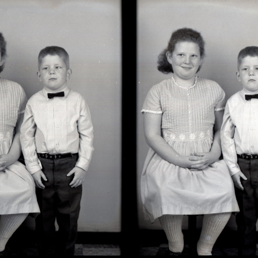 Photo of two separate photographs of the same unidentified two children, an older girl seated and a younger boy wearing a bow tie and standing beside her.