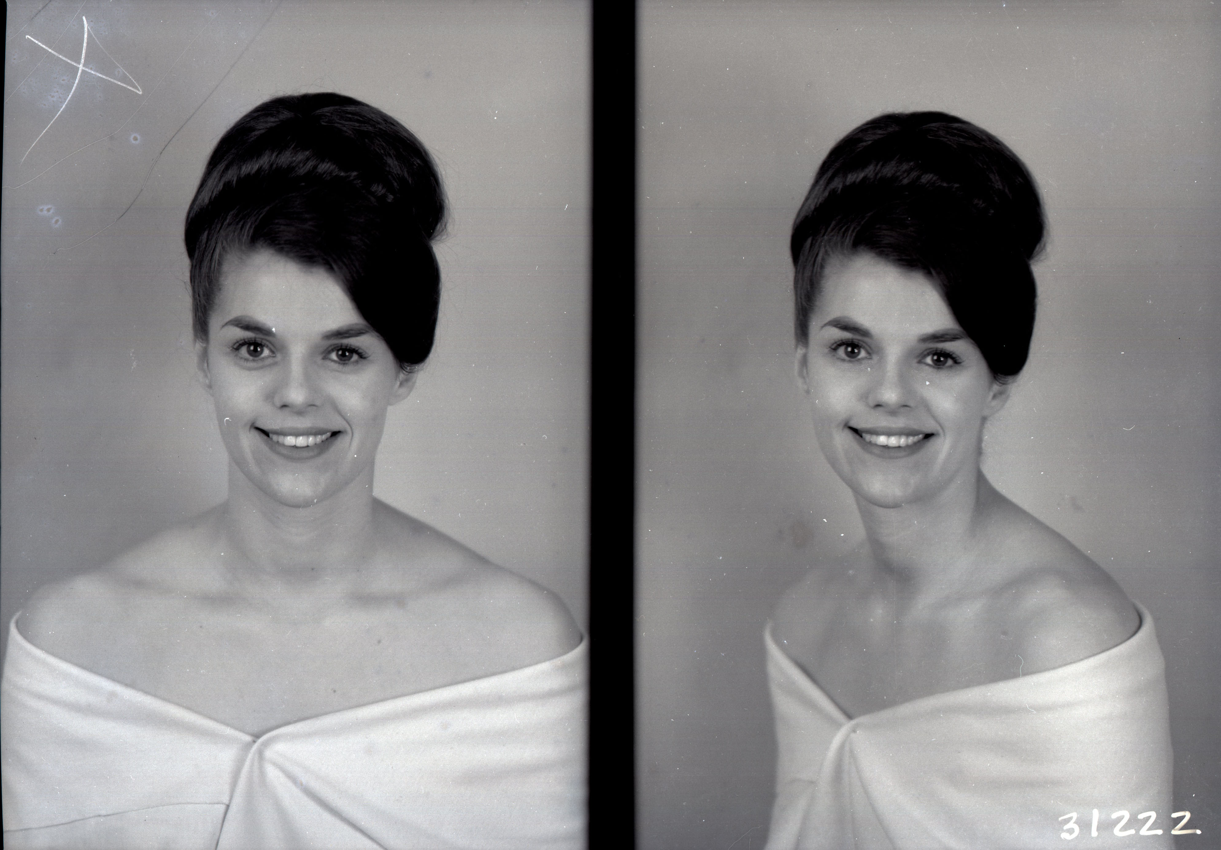 Photo of two separate portrait photographs of the same unidentified woman with her hair puled up and styled.