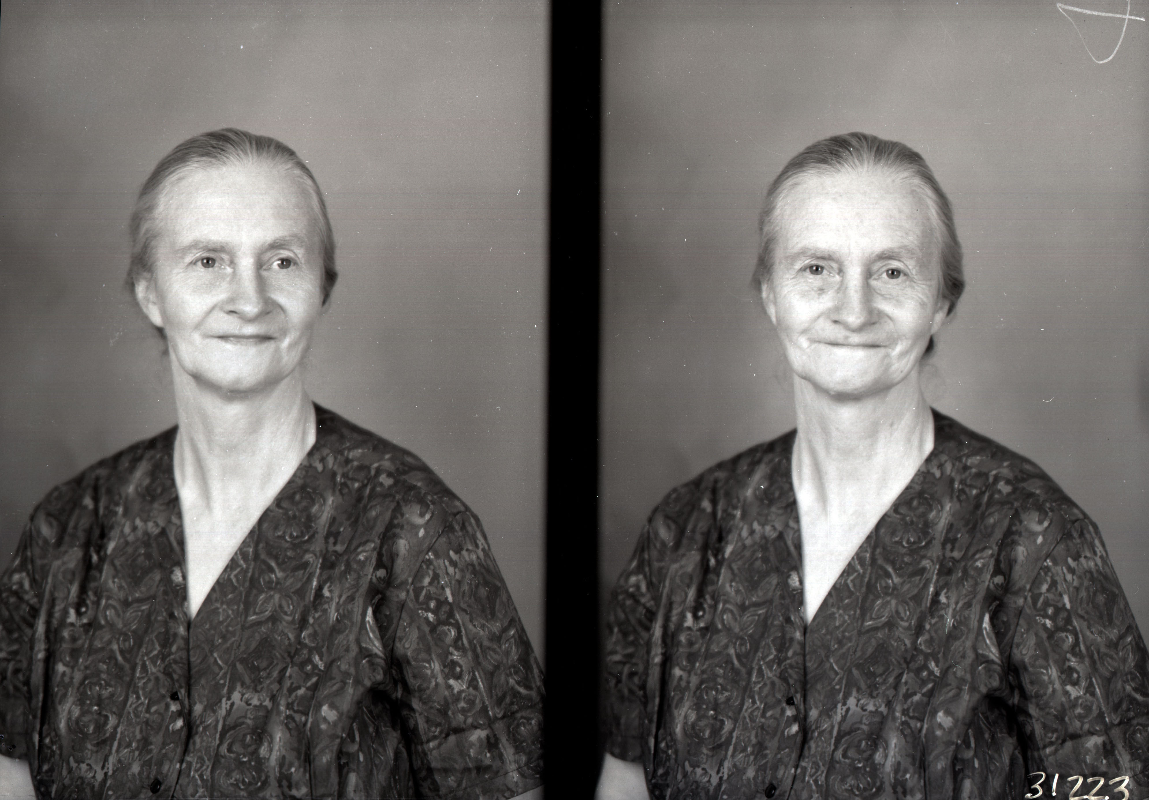Photo of two separate portrait photographs of the same unidentified older woman with her hair pulled back.