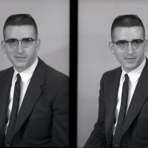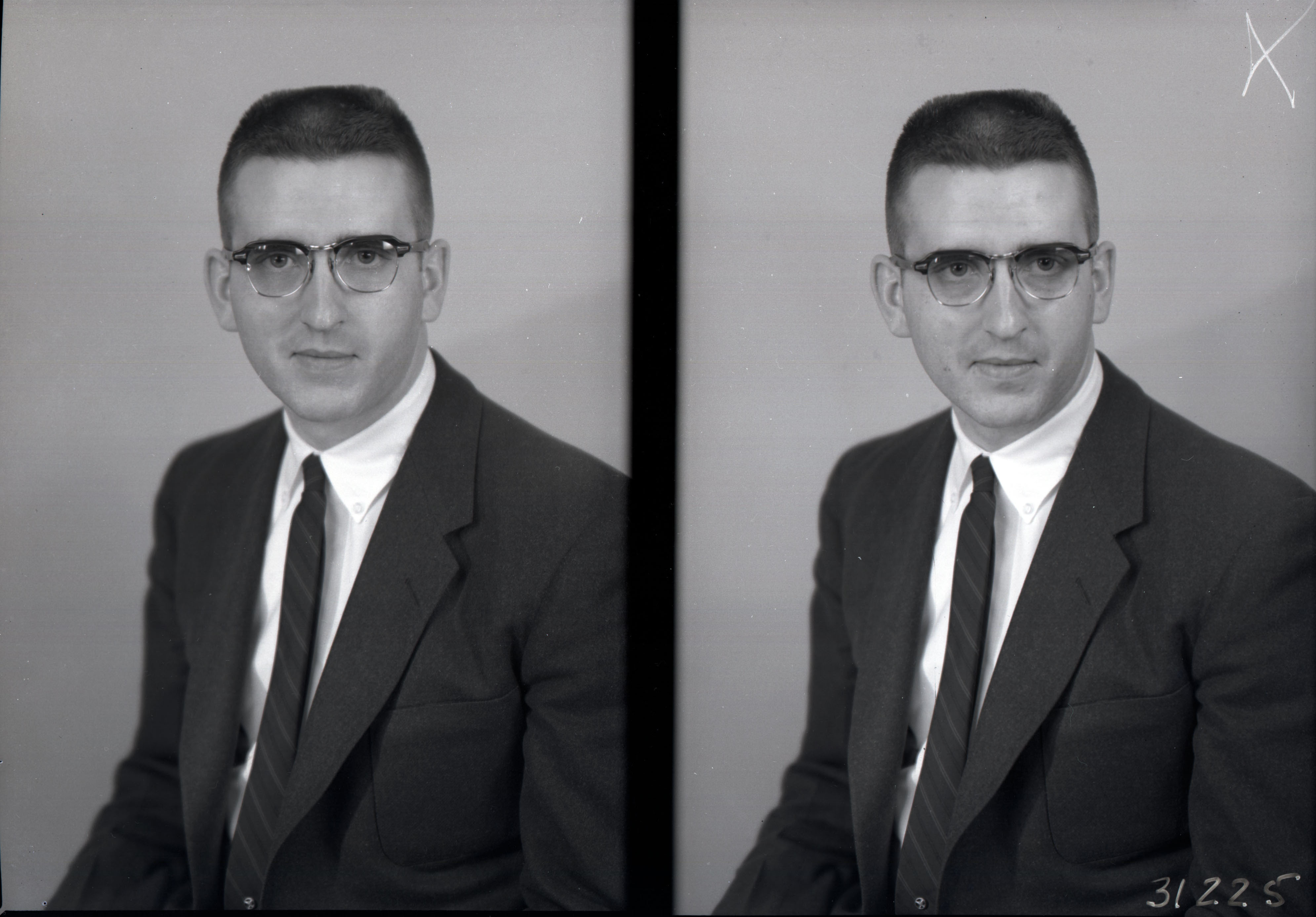 Photo of two separate portrait photograph of the same unidentified young man with glasses and wearing a suit and tie.