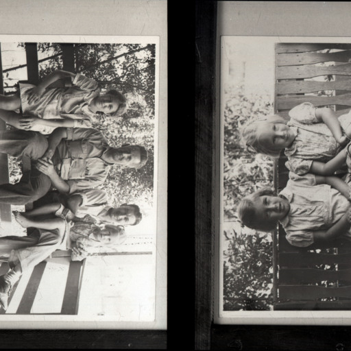 On the right, the same two unidentified girls are seated together on the same porch swing.