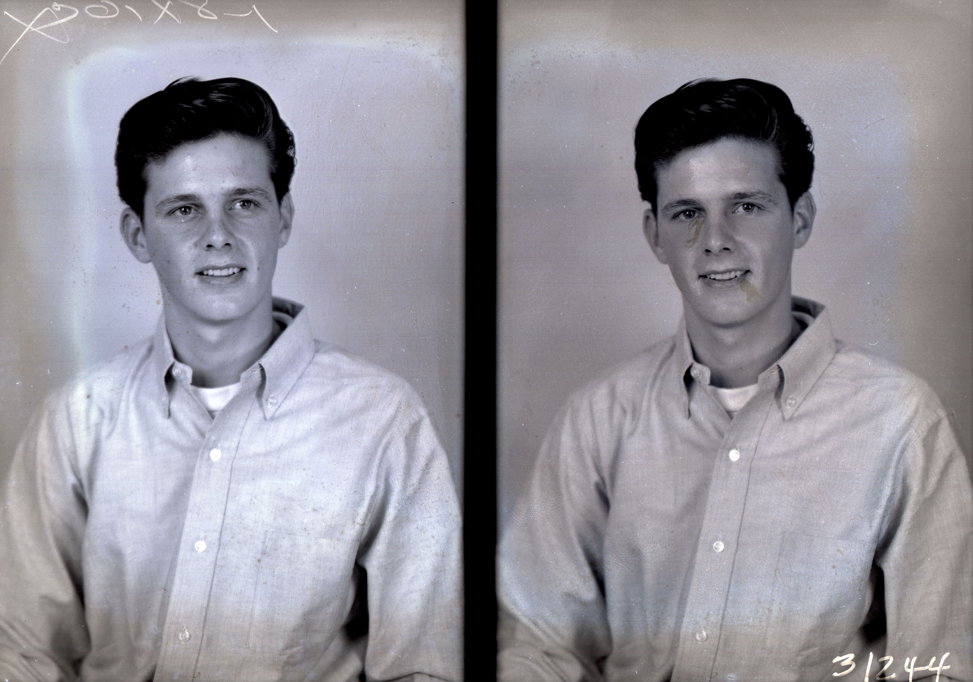 The image on the left has a mark at the top where the photographer noted which of the two images he planned to print.