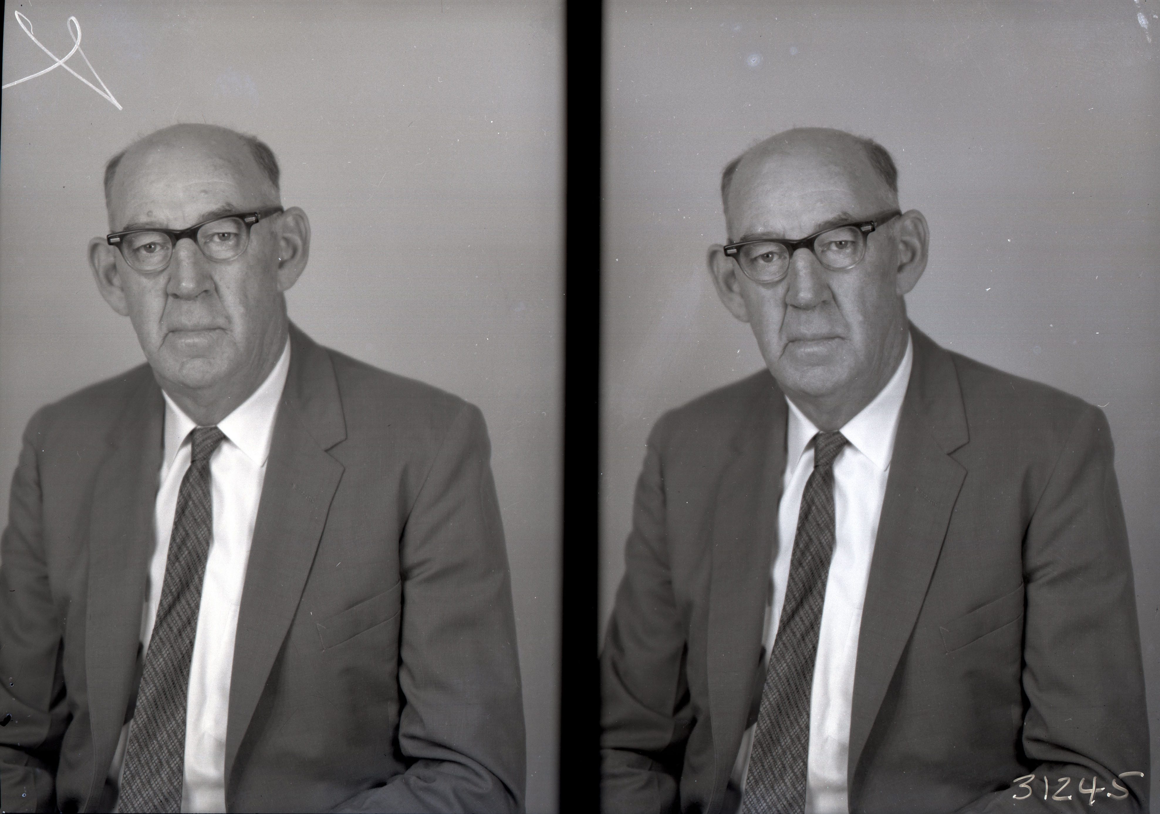 Photo of two separate portrait photographs of an unidentified older man with glasses and wearing a suit and tie.