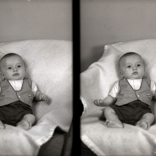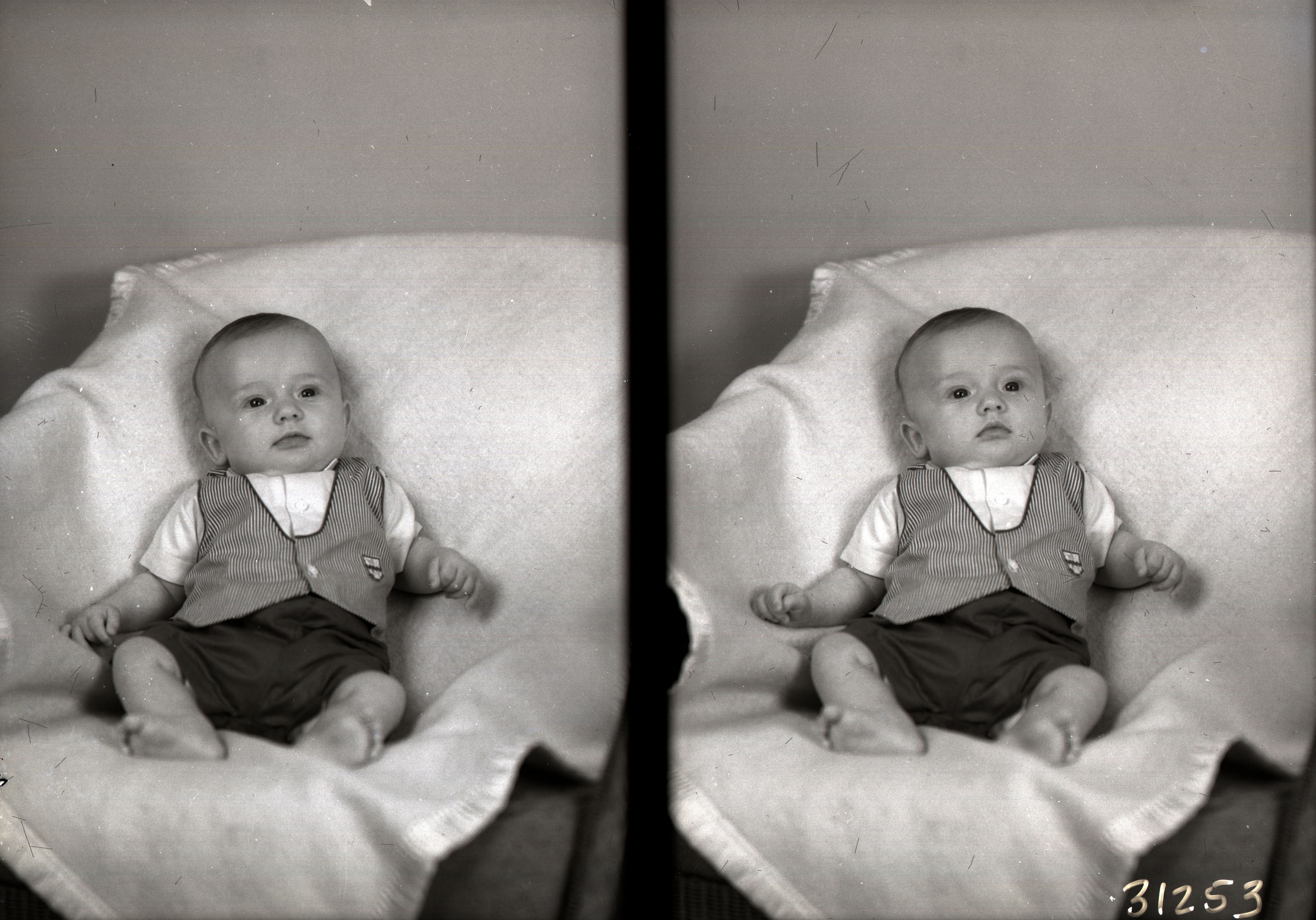 Photo of two separate photographs of the same unidentified barefoot baby in shorts and a striped vest, shown lying against a covered chair.