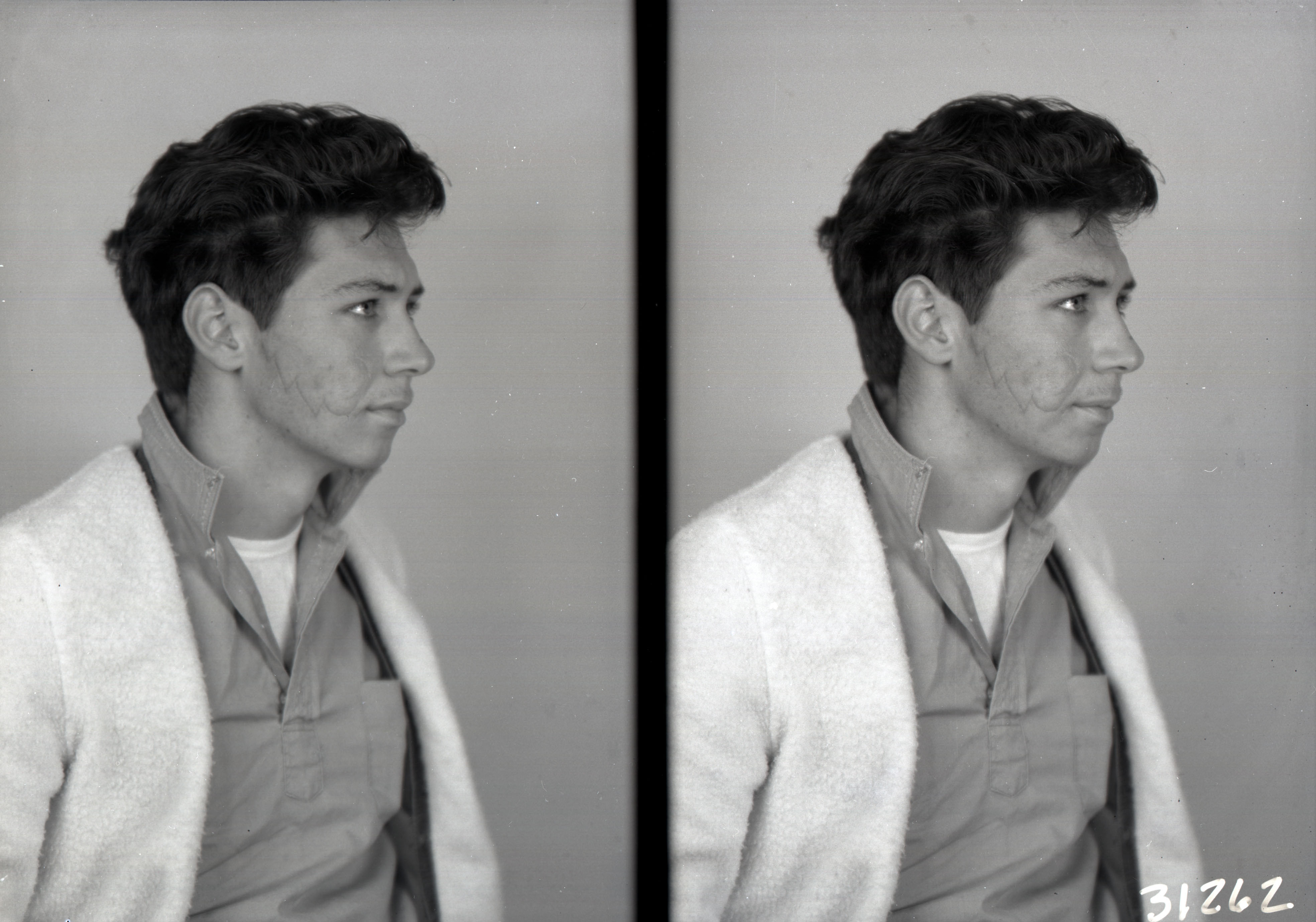 Photo of two separate portrait photographs of the same unidentified young man looking to the side, in profile, and displaying a large scar on one side of his face.
