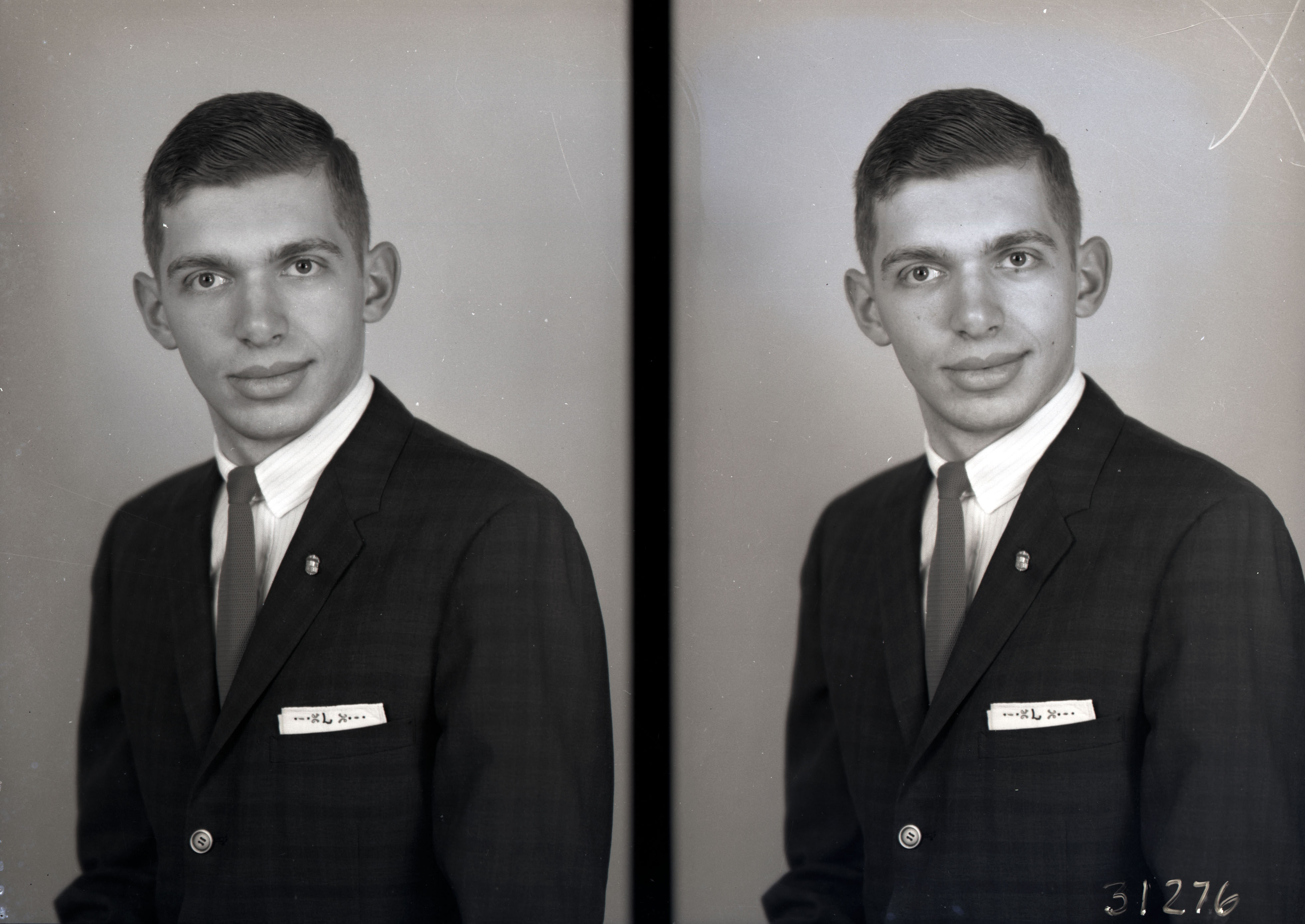 Photo of two separate portrait photographs of the same unidentified young man wearing a suit and tie with a pin on his lapel. A handkerchief is visible sticking out of his breast pocket and is monogrammed with the letter, "L".