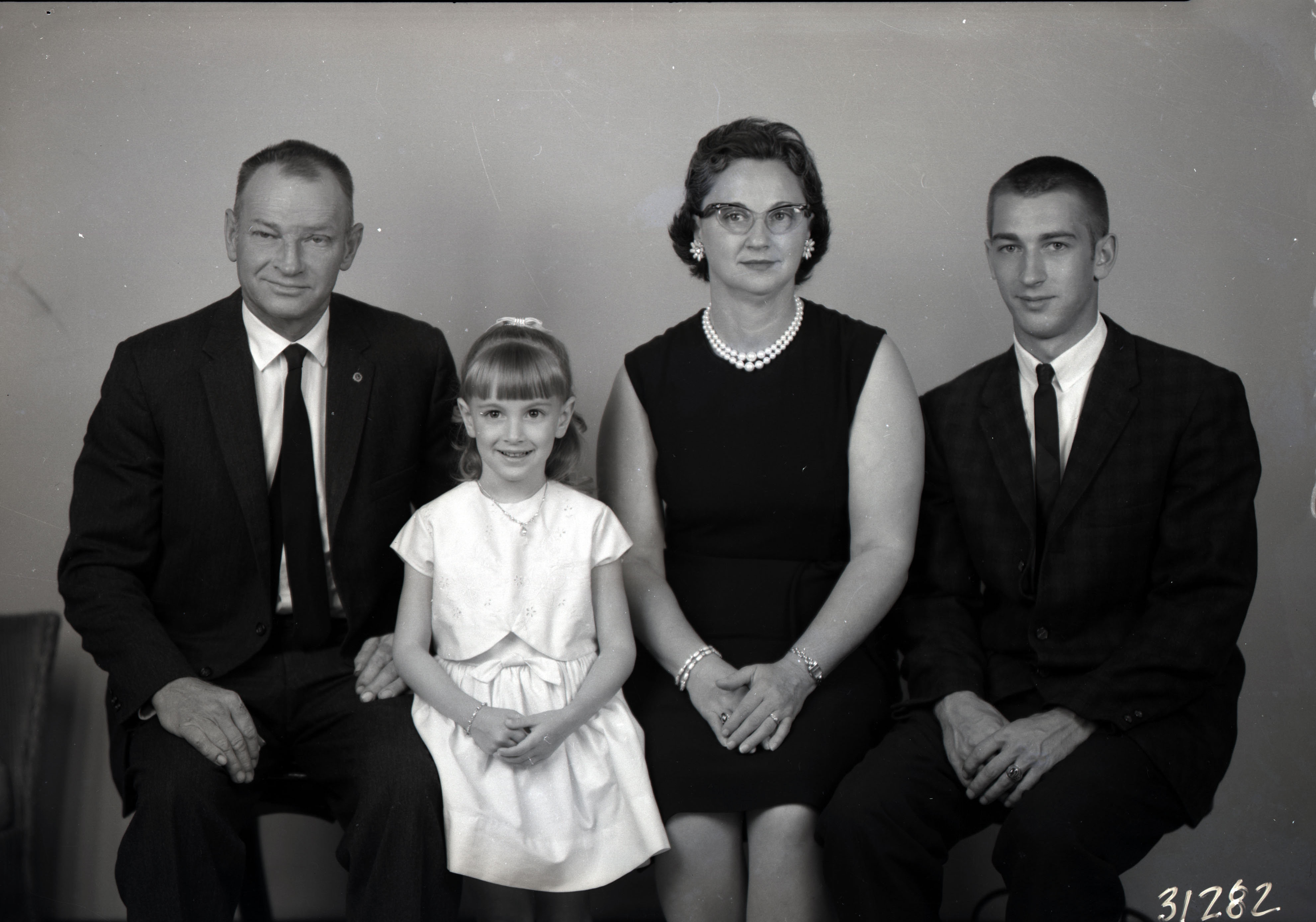Unidentified man and a woman with glasses are seated together, with an unidentified teenage boy beside them and a young girl standing in front.