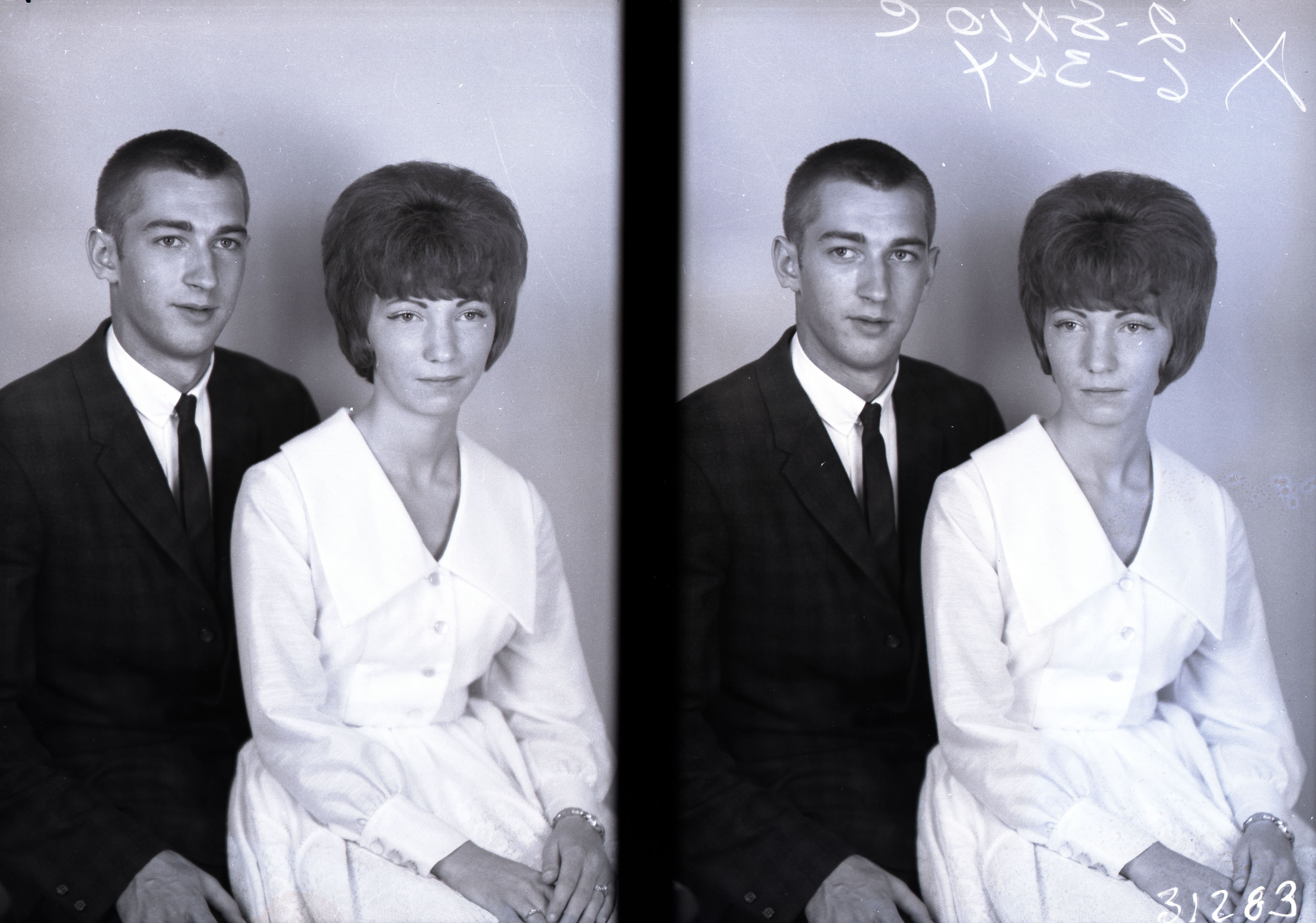 Photo of two separate photographs of an unidentified young man in a plaid suit jacket with an unidentified woman with short styled hair.