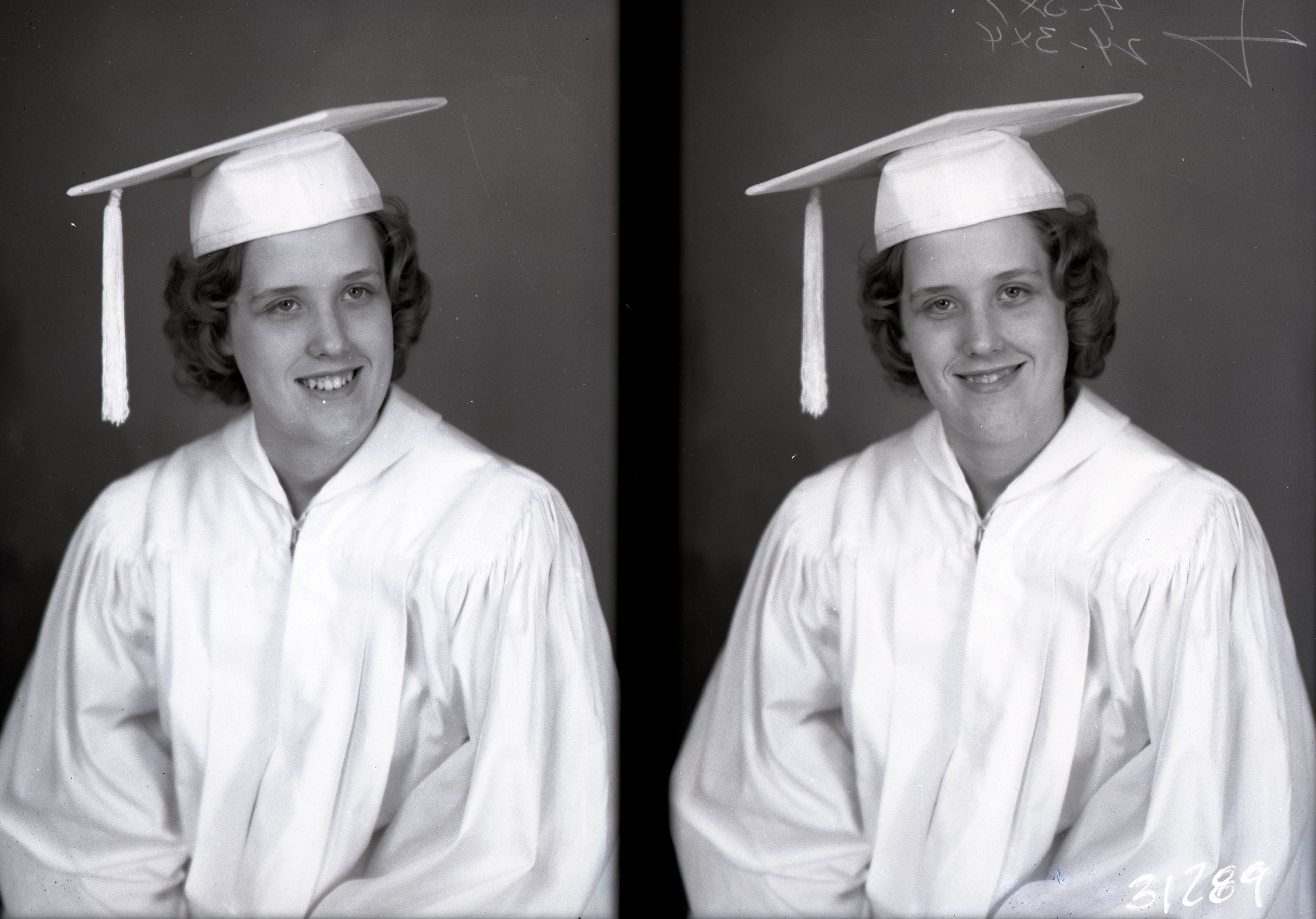 Photo of two separate portrait photographs of an unidentified young woman with short hair and wearing her graduation cap and gown.