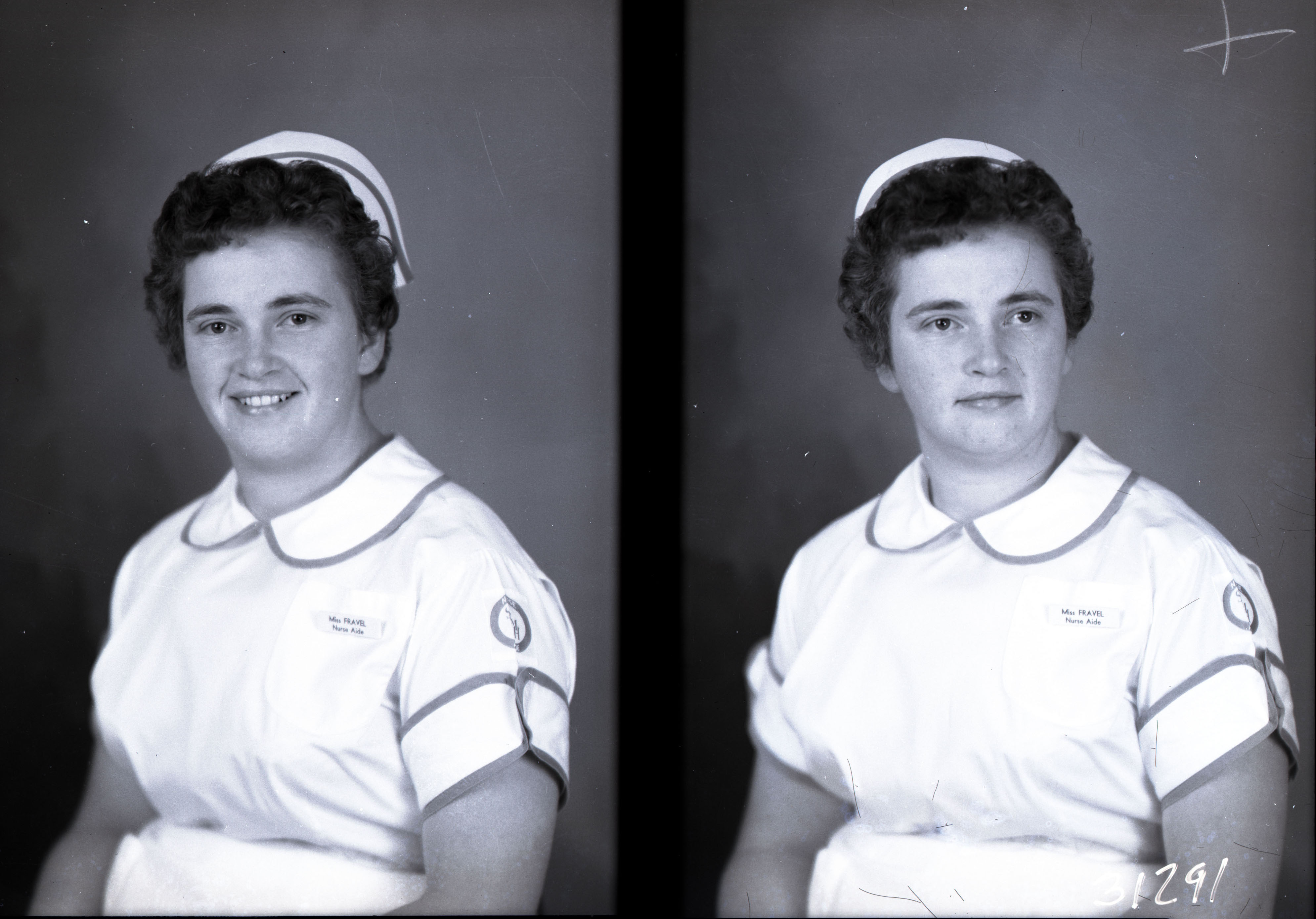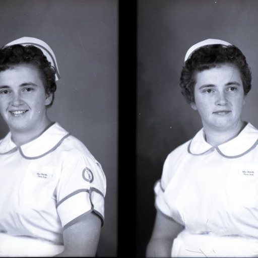 Photo of two separate portrait photographs of Betty Fravel in her nurses' aide uniform and cap.