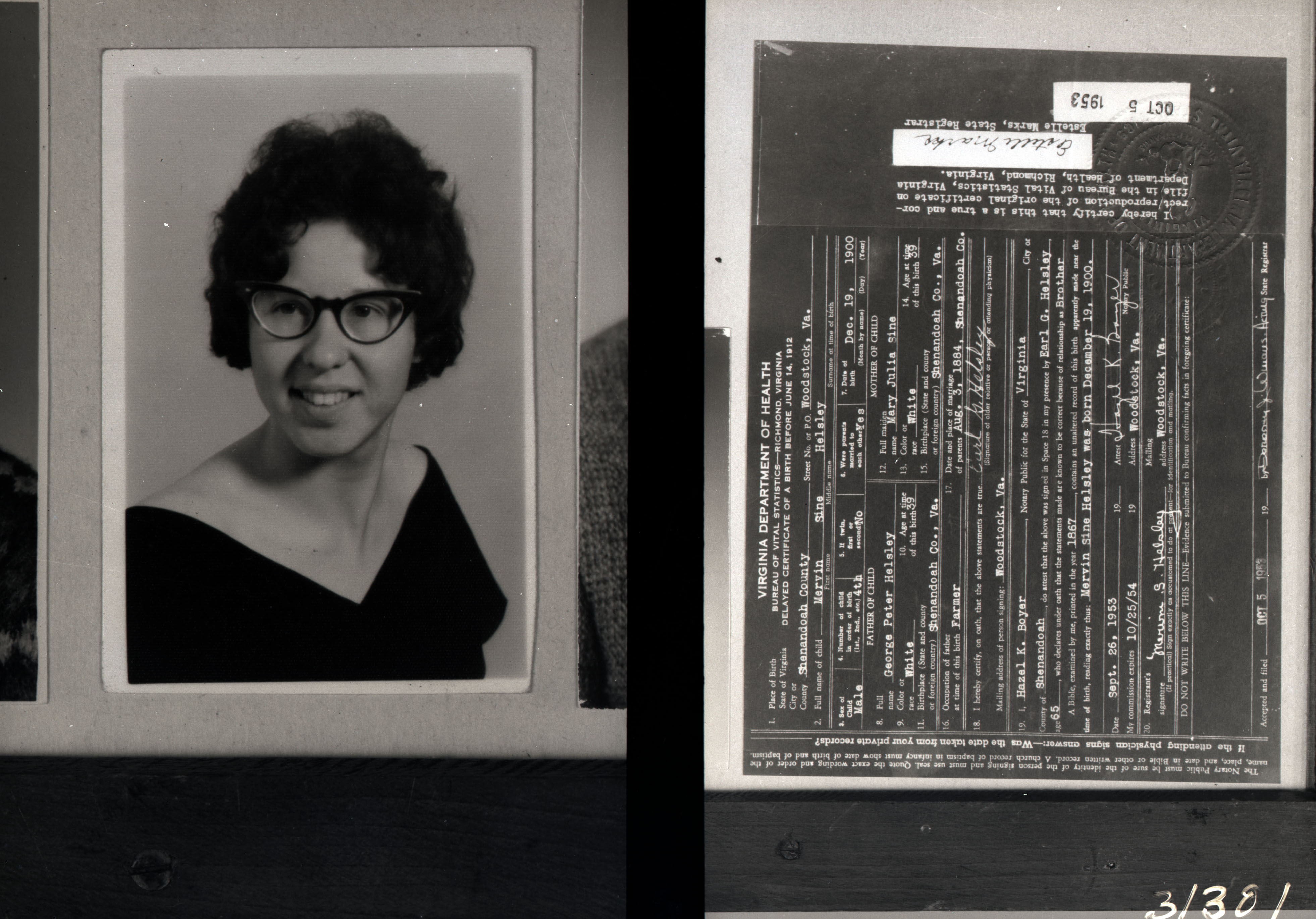 On the left is a portrait photograph of an unidentified young woman with short hair and glasses wearing a photographer's drape.