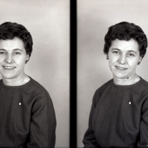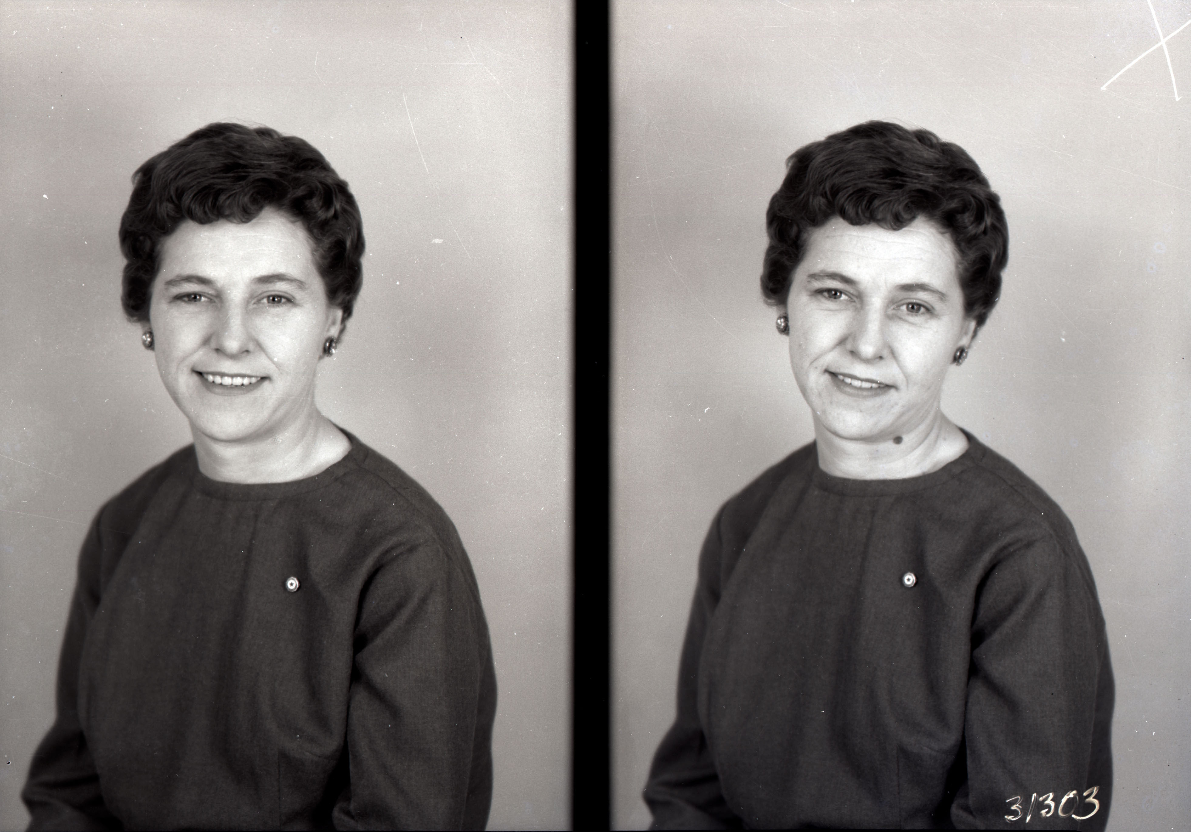Photo of two separate portrait photographs of the same unidentified woman with short hair, earrings, and wearing a small pin on the front of her dress.