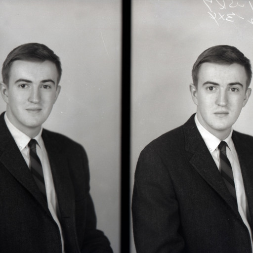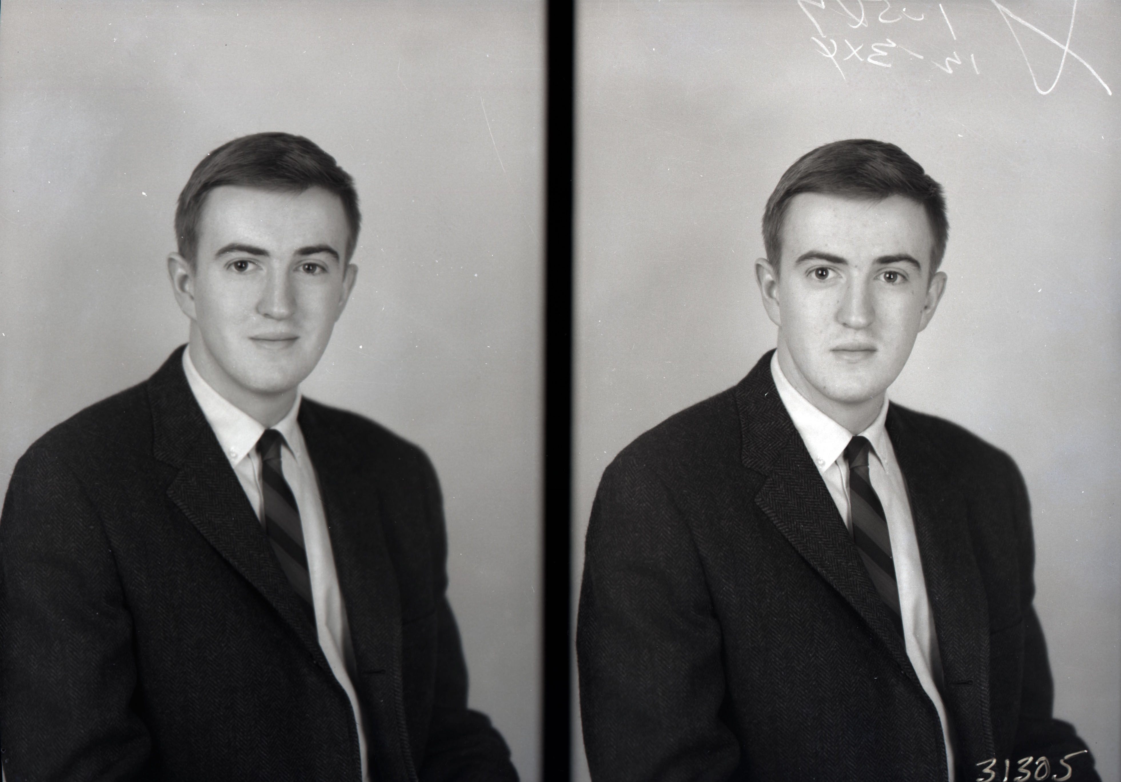 Photo of two separate portrait photographs of the same unidentified young man in a suit and tie.