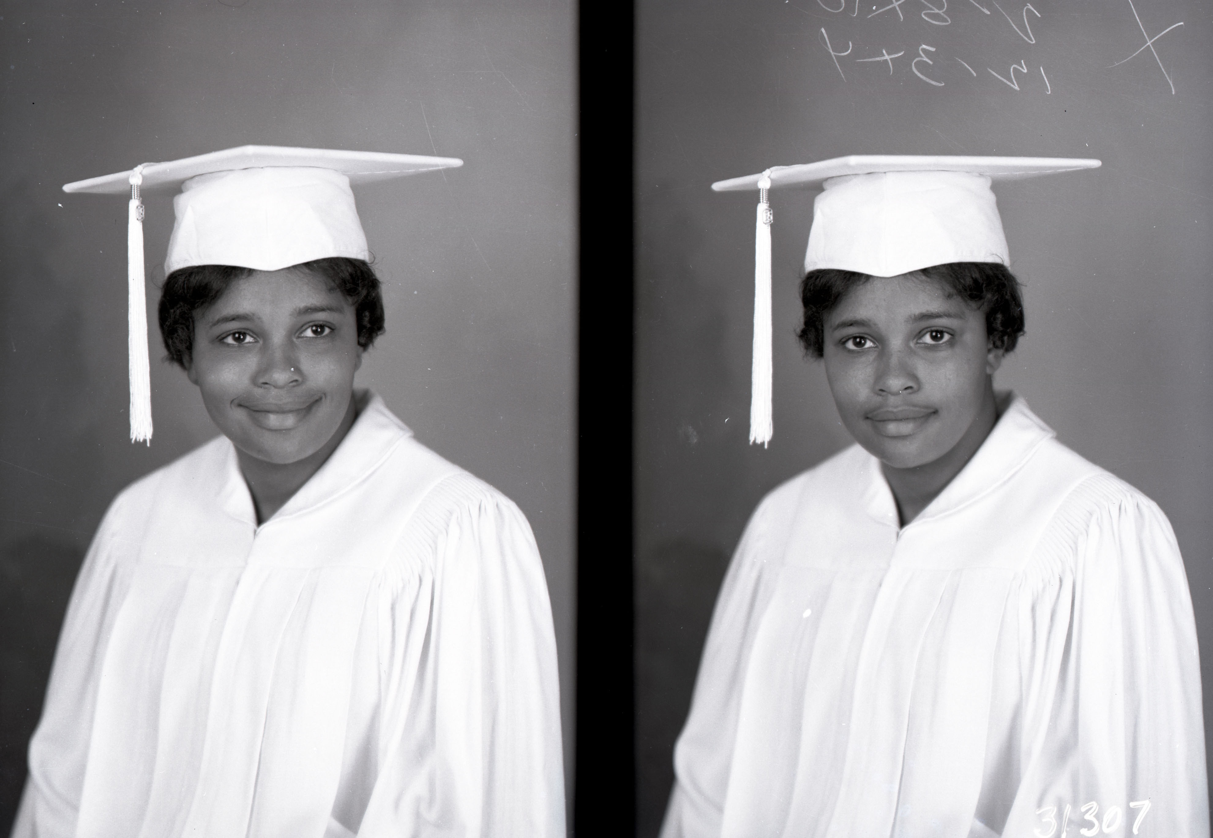 Photo of two separate portrait photographs of an unidentified African American student wearing her graduation cap and gown.
