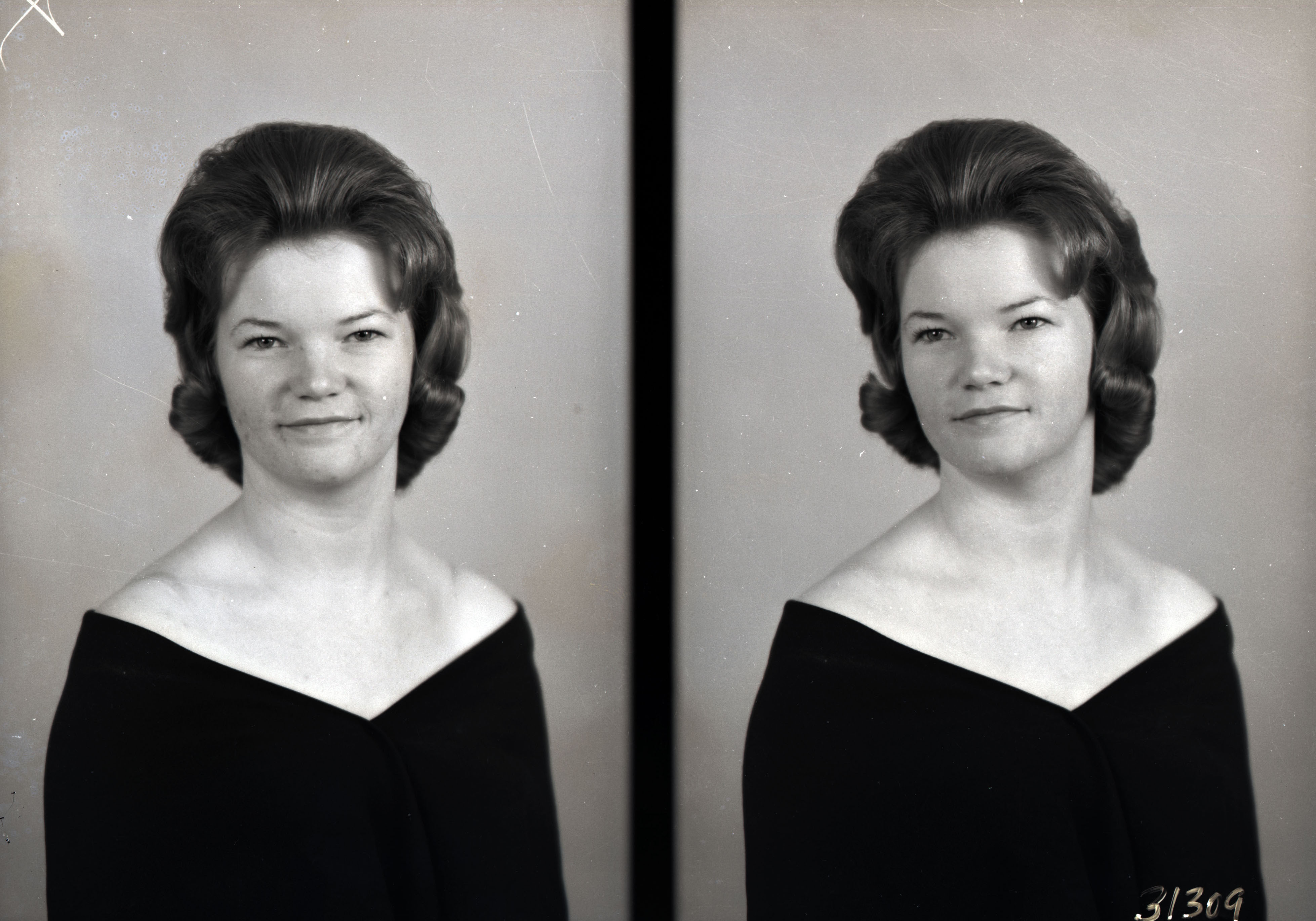 Photo of two separate portrait photographs of Paulette V. (Silcott) Bowers as a young woman with short styled hair and wearing a photographer's drape.