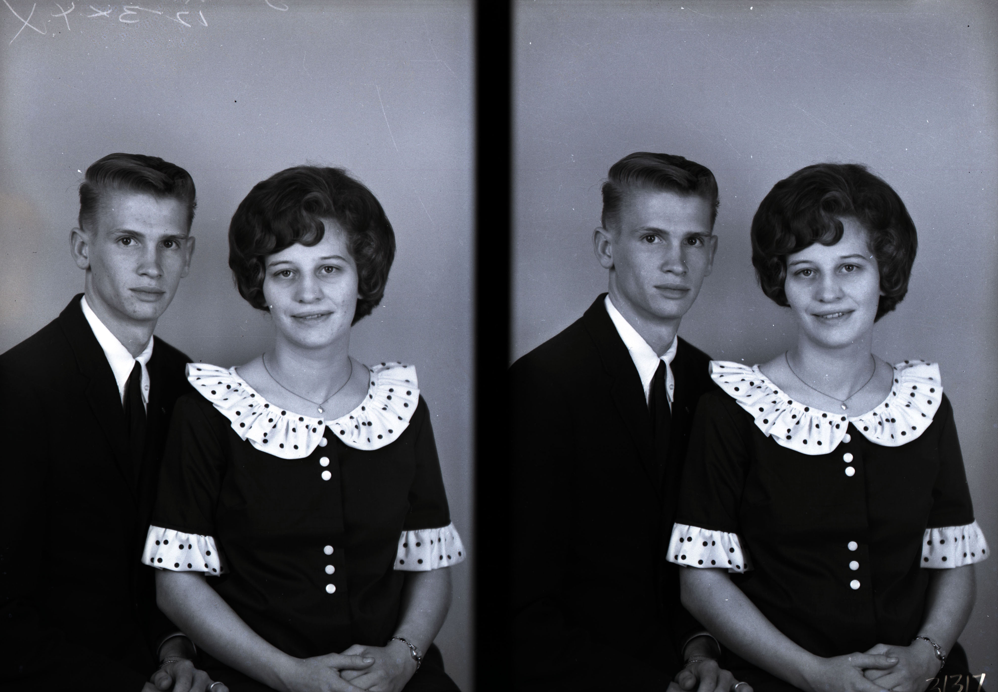 Photo of two separate portrait photographs of the same unidentified young man and woman seated together.