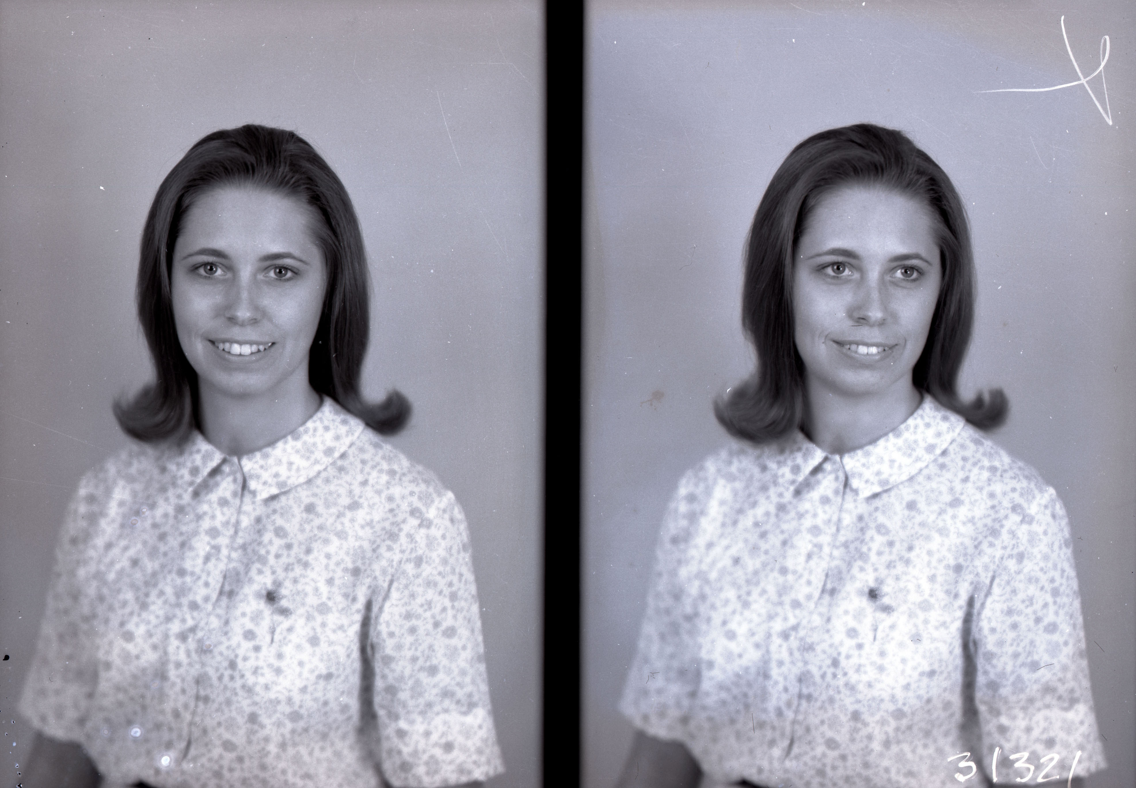 Photo of two separate portrait photographs of the same unidentified woman with straight hair curled outwards and wearing a short-sleeved print blouse.