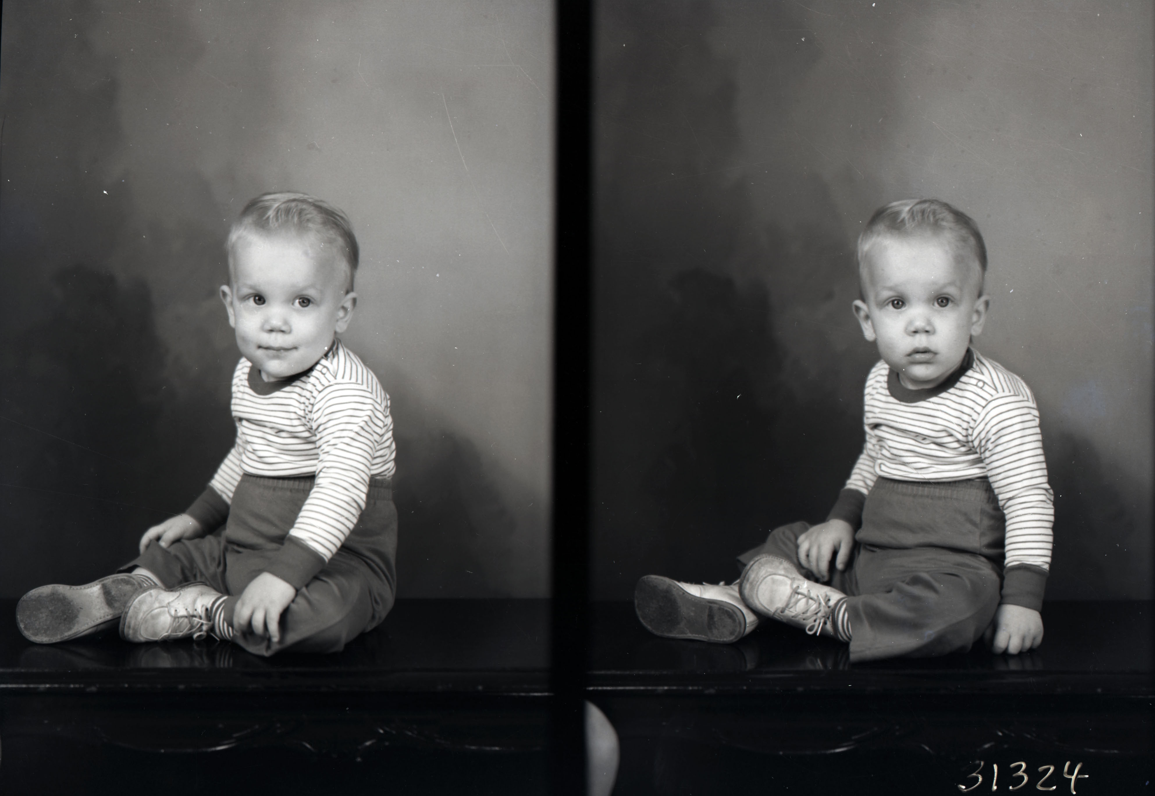 Photo of two separate photographs of the same unidentified young boy wearing a long-sleeved striped shirt and pants.